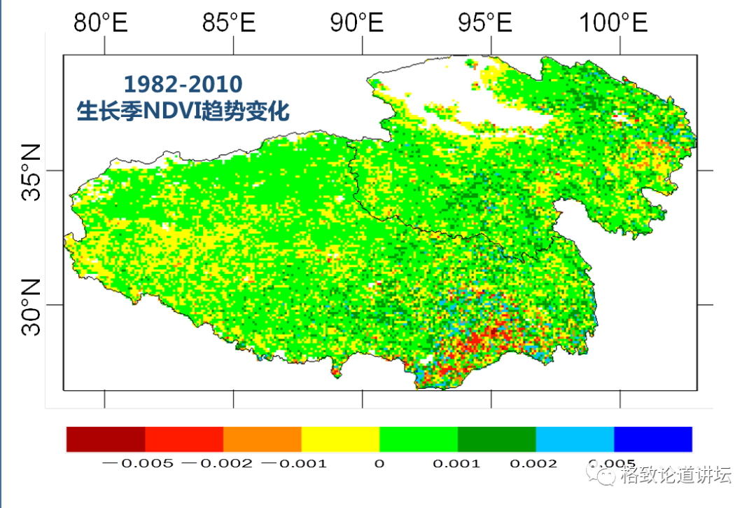 图中颜色变绿是代表逐渐增加的趋势,可以看到随着气候变暖变湿,青藏高原的植被一直向好的方面发展。