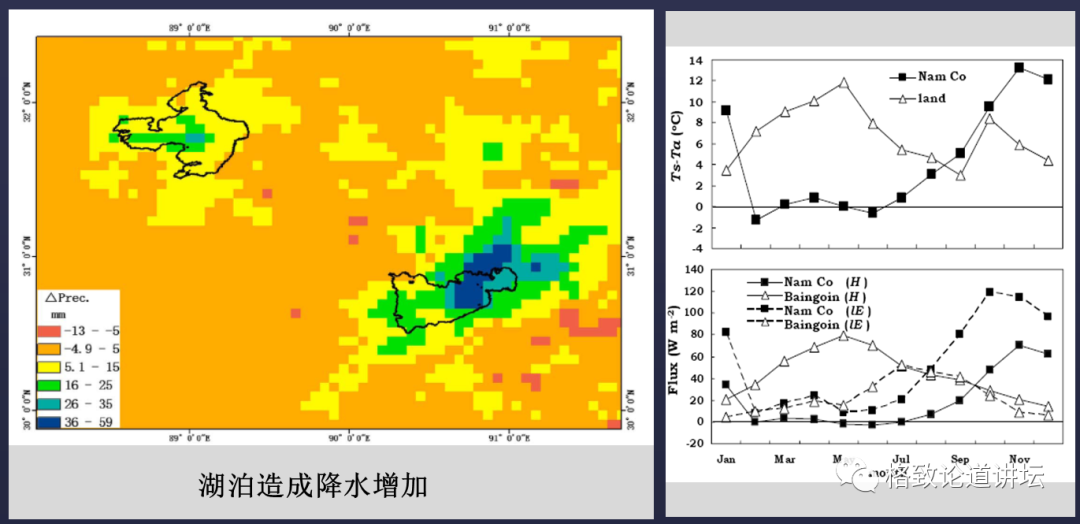 青藏高原的湖泊扩张也对整个气候变化带来一定的影响,特别是湖泊水面积的加大,会增加水循环和大气的含水量。