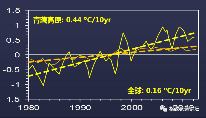 这张图显示的是青藏高原的气温升温率和全球升温率的对比。亮黄色线条的是青藏高原的升温率,达到每十年0.44℃。而全球每十年只有0.16℃,可见青藏高原的升温率是全球平均的两倍以上。