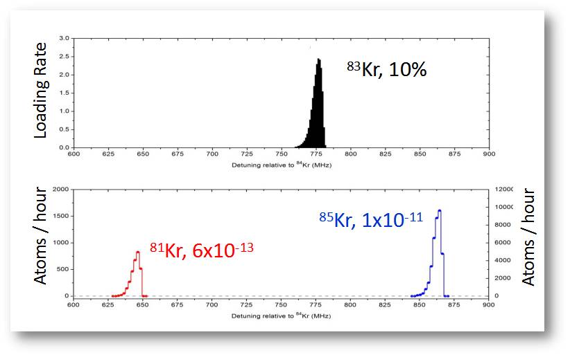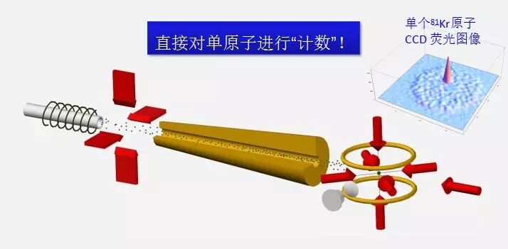 这个重要性早在1969年就提出来了,由瑞士著名的科学家Hans Oeschge和他的学生提出来的,但是检测问题一直没有得到解决。难在哪里?它们的同位素丰度极其低,远远低于质谱仪所能达到的探测极限。85Kr是2x10-11,81Kr是6x10-13,探测1000个原子本身不算难,但是这些原子是混合在比它多12个数量级的其他Kr原子里面,这个非常难,39Ar就更低了,是8x10-16。