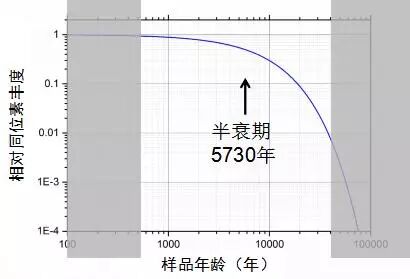 碳-14是气体同位素,但是它在大气中氧化成二氧化碳这样一个稳定气体,这样就得到了充分混合,这是非常重要的因素。它定年有一个有限的范围,为什么呢?这跟它的半衰期有关。它的半衰期是5730年,当年龄远小于半衰期的时候,变化非常小,这一段不灵敏;另外一方面如果年龄远超过半衰期的时候,同位素分布太低了,不好测。所以围绕它的半衰期,碳-14的有效定年范围是从几百年到几万年。