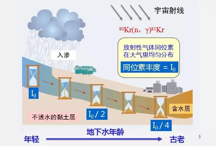 但是一旦水流入地下以后和空气隔绝了,不再有新鲜的80Kr原子补充进来,从那个时候80Kr同位素分布就会按照核衰变的规律逐年减少。水结冰也是这个道理,水结冰以后,就不再有新的80Kr进来,所以冰量或者地下水量被提出来以后,分析里面80Kr的分布,就可以知道这个水的年龄。我们知道水本来没有年龄,所谓的“水体的年龄”,就是这包水和空气已经隔绝多少年了,表面水它的年龄就是0。随着这一条水流线,这个水的年龄会慢慢增长。