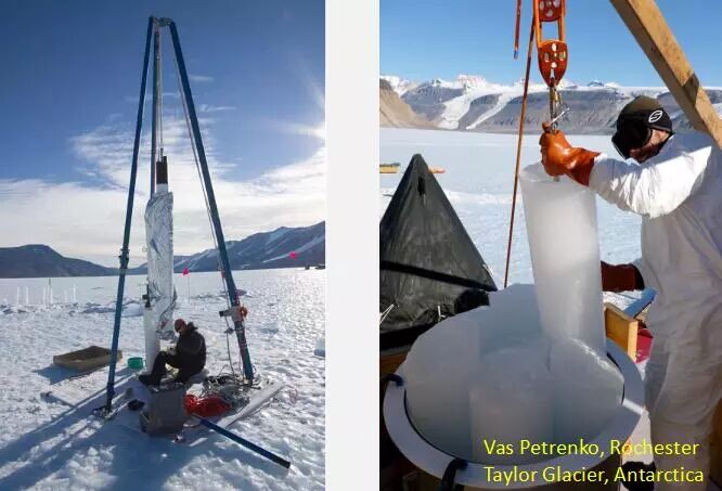 下面讲冰川,从冰里面取水稍微麻烦一点,这是我们合作的同事,美国罗切斯特大学的。他带一个大锅到南极洲去,把冰放进去,冰融化了以后,里面的气体跑出来,送到我们的实验室。我们找到了12万年前的“老”冰,离地表很近。南极洲有很多蓝冰区,大家觉得蓝冰区的冰很“老”,我们用81Kr确定以后就可以在蓝冰区找到很“老”的冰。
