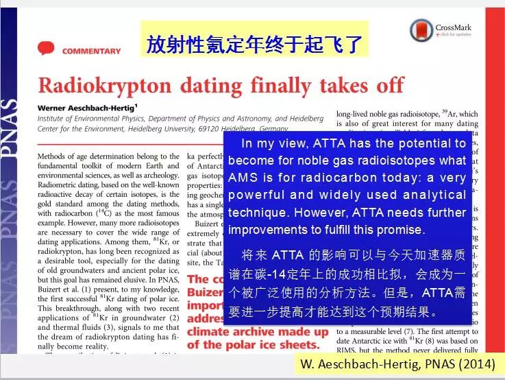 我们这个方法和它的应用在国际上也得到了比较好的评价,这是2014年美国科学院院报上对我们工作的评述,作者是海德堡大学的教授。他说将来我们在ATTA的影响可以与今天加速器质谱在碳-14定年上的成功相比,会成为一个被广泛使用的分析方法,但是ATTA需要进一步提高才能达到这个预期。