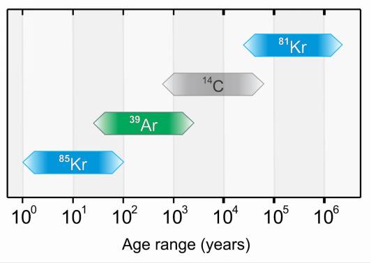 85Kr,39Ar,81Kr都是惰性气体,非常巧,这几个同位素半衰期分布在不同的数量级,它们的有效定年范围一个接着一个,连续覆盖从几年一直到140万年。目前碳-14定年已经被解决了,我们做单元子探测,就是为了解决这三个同位素。另外还说一点,惰性气体是非常好的,因为它不参与化学反应,我们说它是理想的定年同位素。