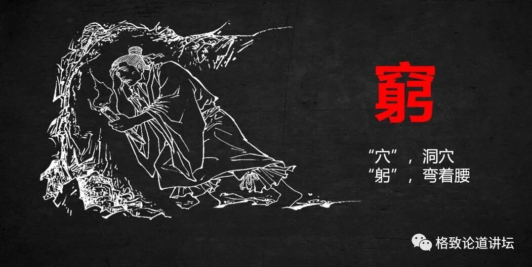 上面是一个洞,下面是一个人,弯着腰像弓箭一样,在洞里走路,这是我们古人穴居的表现,这个叫穷。