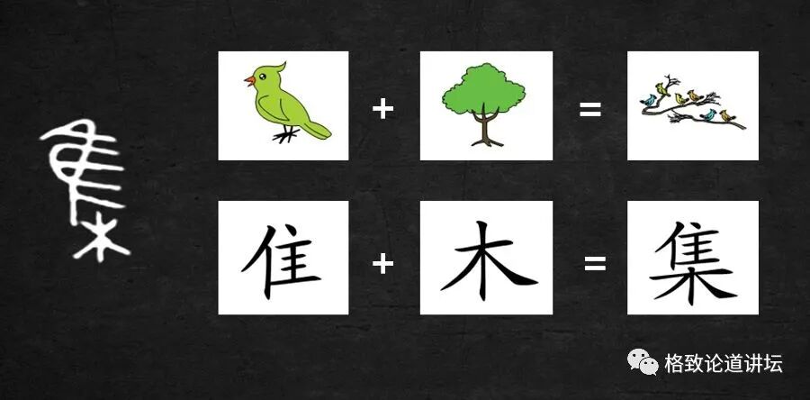 “集”,是很多的小鸟站在树上,它们开一个欢乐的party,这就是集合。