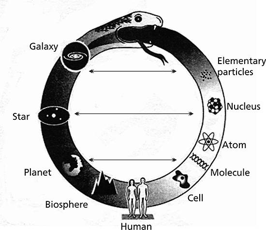 下图显示不同尺度的物质世界,大至天文,小至基本粒子。