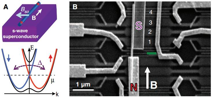 我下面用图进一步对以上提及的几个主要的探索马约拉纳零能模做一个说明。这张图是关于纳米线的拓扑超导。在一个超导体上加上一维的纳米半导体链条。他们这个组是首先发现马约拉纳零能模的。这个组现在是微软把它买了,现在在技术方面是跑在世界最前面。
