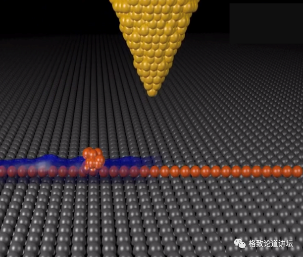 针从表面上划过的时候,我们去测量针和原子之间的电流。如果针和原子之间非常近,电流就很大,远,电流就小,这样我们就可以通过观察电流的大小来判断有没有原子。