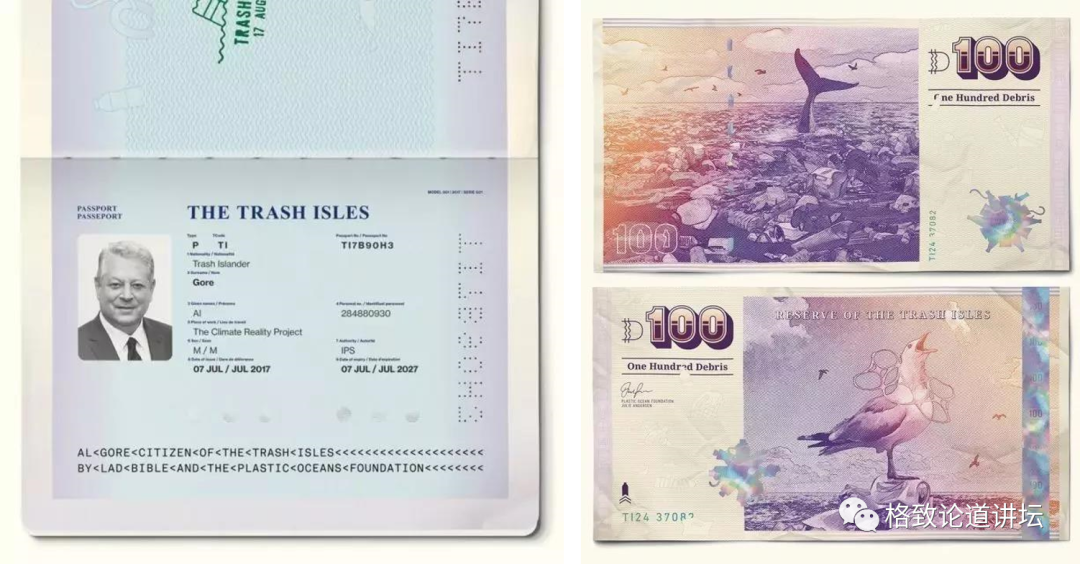在这个最大的塑料岛,美国海洋塑料基金会一直号称要申请联合国的第196个国家,美国的环保领袖、前副总统戈尔,号称是垃圾群岛共和国的总统。网上还有人很戏谑地发了货币,它的货币就是100个塑料碎片、50个塑料碎片。