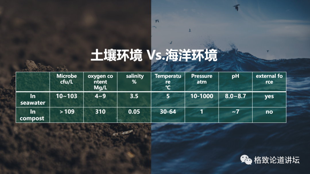 大家会说,海洋的废弃塑料是不是跟陆地一样,如果降解塑料解决了陆地上的塑料问题,那放到海洋里用不就结了。
