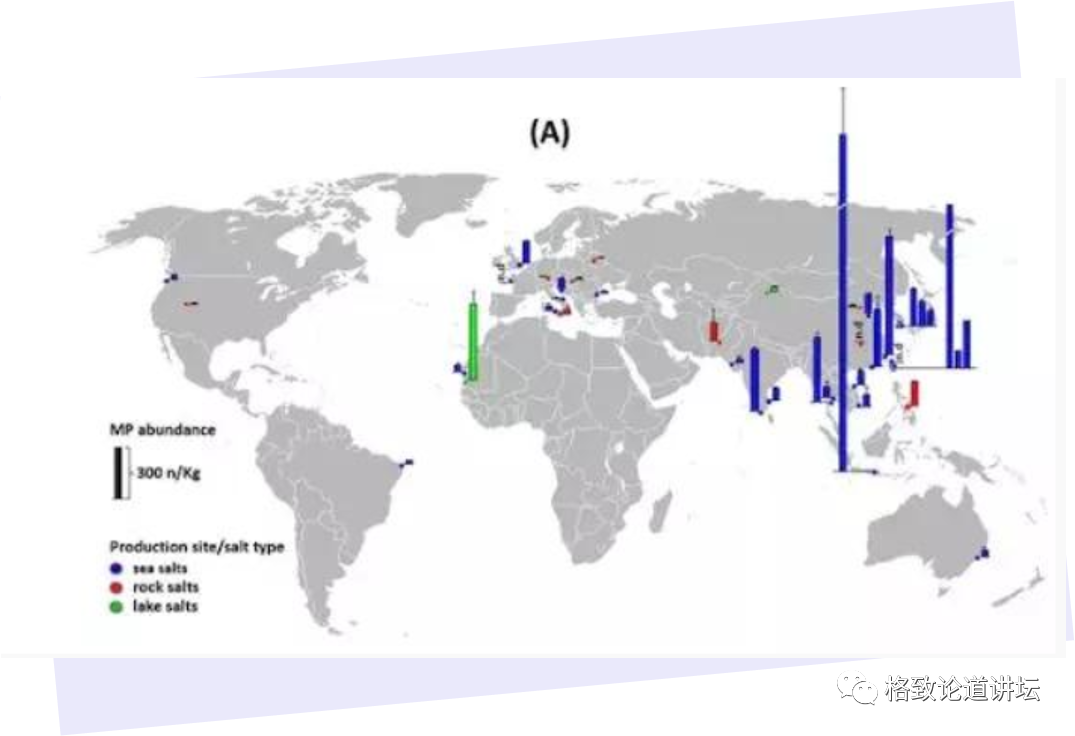下图中,柱子的高度表示当地盐里含微塑料的多少。准确地说,中国周边的盐,指的是超市的盐,而不是海里刚晒出的盐,基本上一克里面有一颗微塑料。