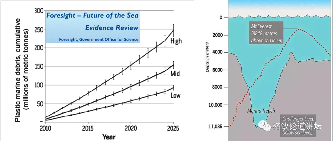 英国国家科学办公室测出了塑料在海里发展速度的数据,这个数据很惊人。如果正常发展,可能一年就能在海里投入好几亿吨。如果我们人类干预的话,可以少一点儿。