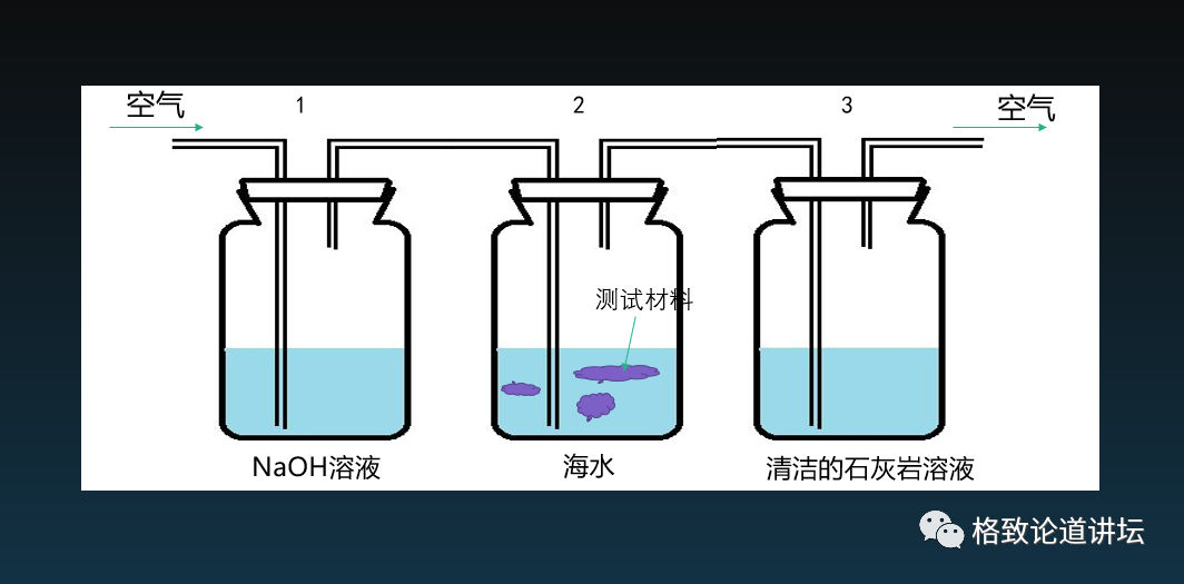 所以,针对这个问题,我们做了很多的工作。把塑料放到一个唯一碳源的海水里,初始时里面的水没有二氧化碳,然后将去除二氧化碳的空气导入到装置中,最后测试有没有二氧化碳生成。