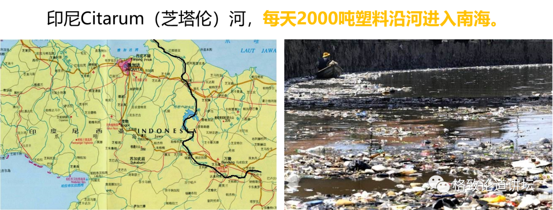 颜色标深的是印尼爪哇岛的芝塔伦河,只有272公里。这条河周边大概住着3000万的印尼人民,他们每天把约2000万吨的废弃塑料扔到这条河里,这些废弃塑料就从这条河流向了南海。