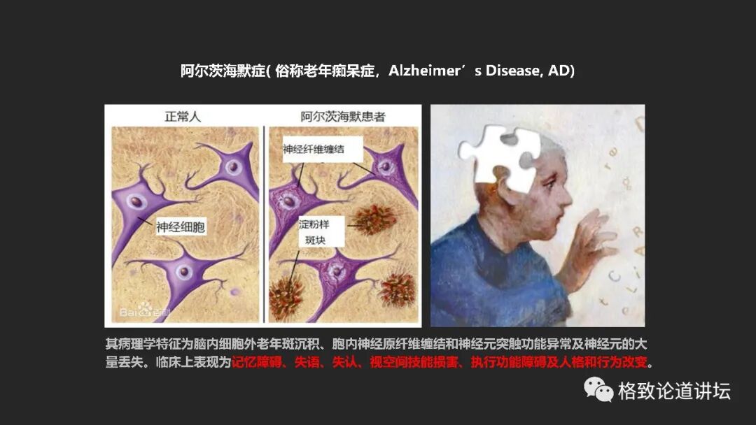 翻开任何一本教材,我们都会看到教材里面写着阿尔茨海默症俗称老年痴呆,它的病理学特征是脑内细胞外老年斑沉淀和神经细胞内原纤维缠结和神经元突触功能异常,神经元大量丢失。