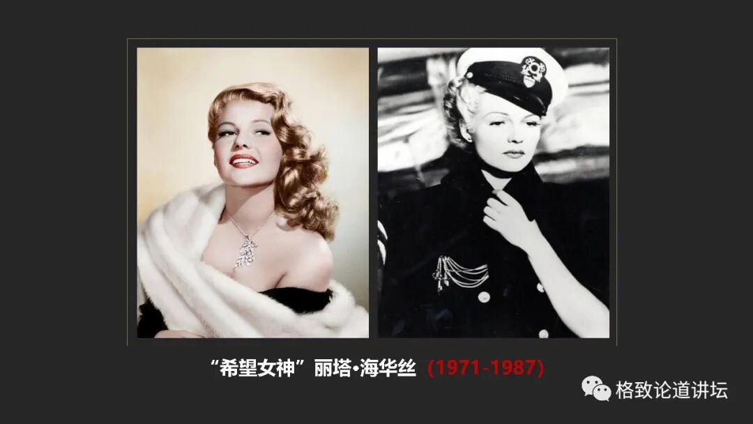 还有人说,你前面讲了很多人,我是美女,美女没事吧?很遗憾。我们来看美国的“希望女神”丽塔·海华丝。