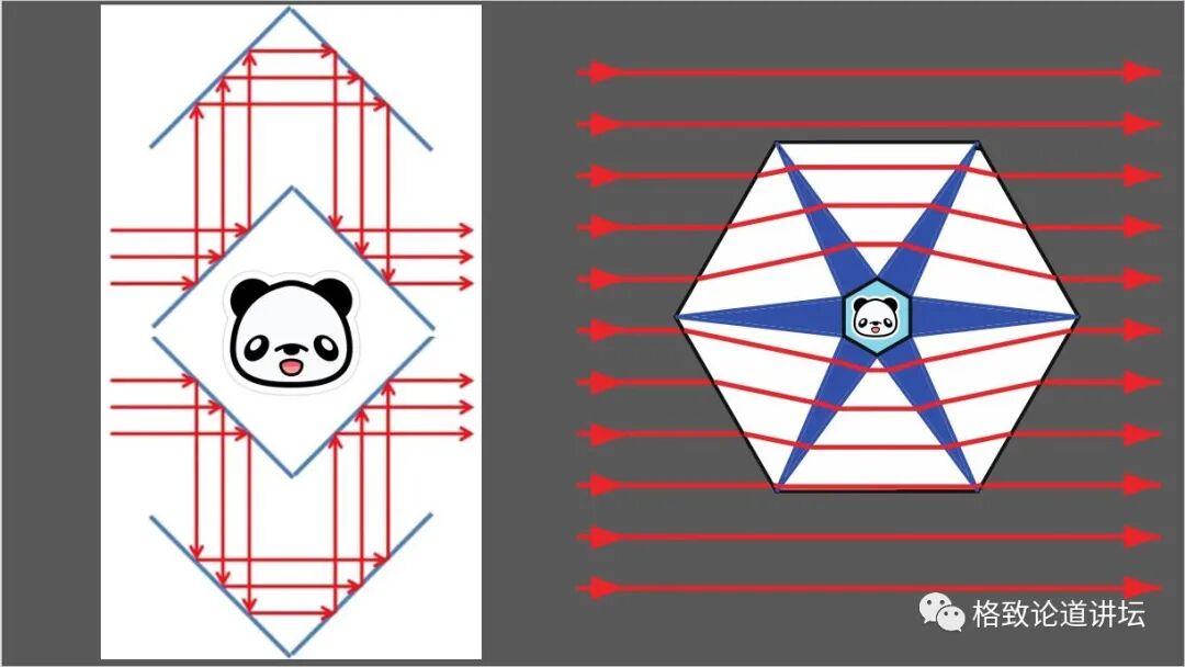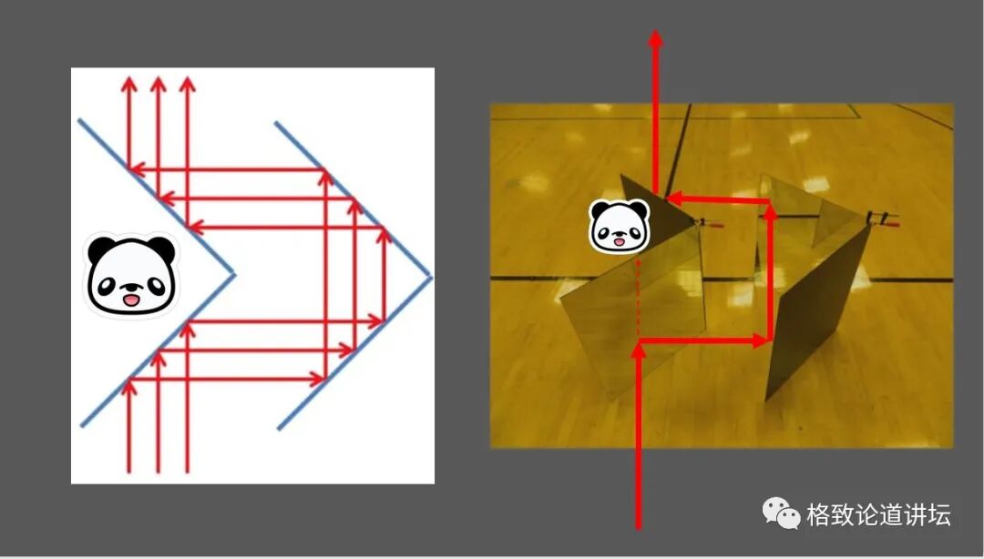 当观察者在屏下方时,光经过四次的反射,绕过了熊猫所在的区域,所以你依然能够看到熊猫背后的景象。这就是刚才这个实验的基本原理。