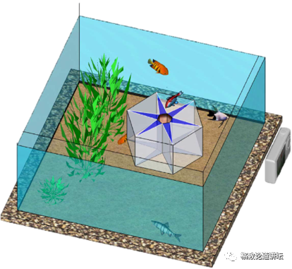 这是上述实验的原理图——把这个六角形的隐身装置放在鱼缸中间,所以当小鱼游进这个柱状体的时候,在鱼缸一侧的观察者却只能看到背后的水草,而看不见这条小鱼。