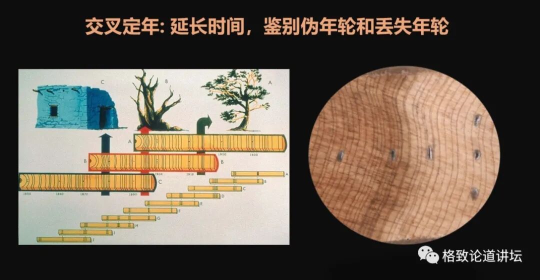 我们的目的是要知道它是哪一年形成的,所以要知道年代的话,就是我们树木年轮专业一个方法,叫做“交叉定年”。