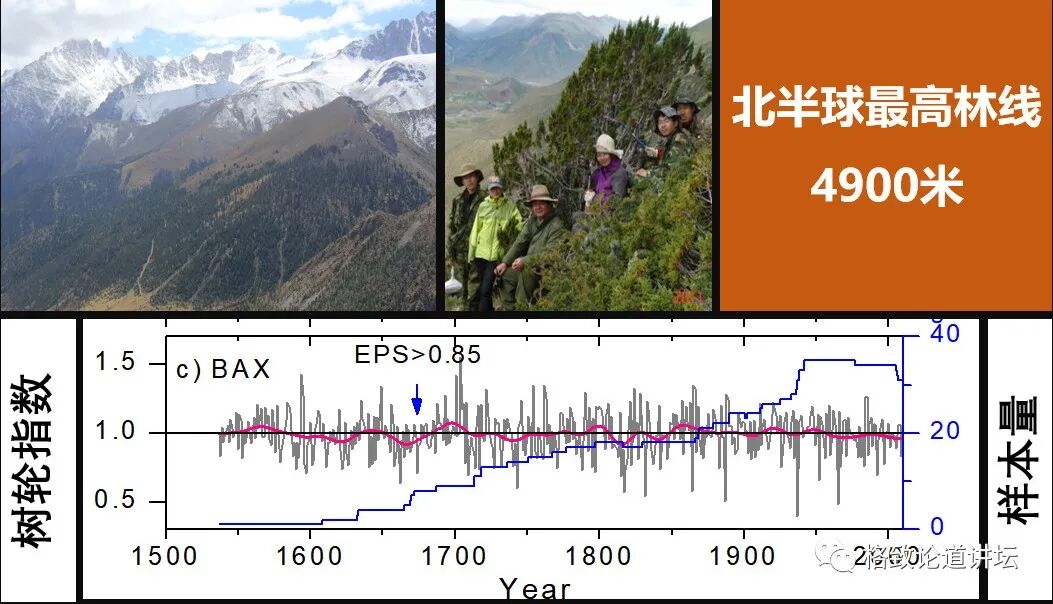 这个树450年前就站到这么高的位置上,那时候温度相当低,是小冰期。但是随着后面的温度升高,这个树林并没有再往上走,是真的温度控制吗?