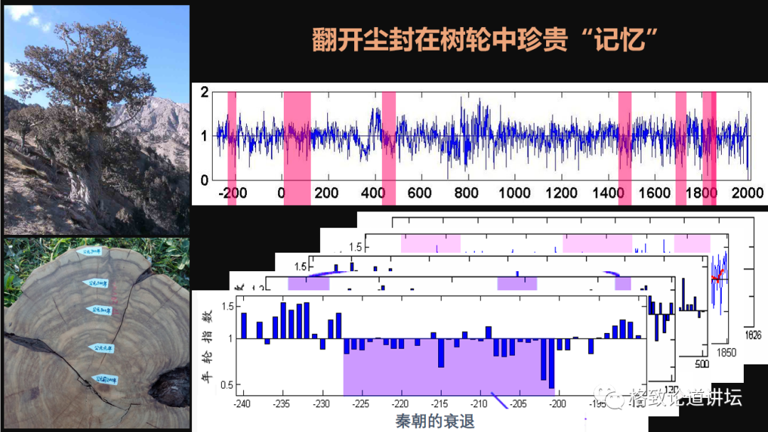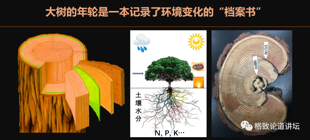 所以我们树木年轮学的工作,就是看这个大树年轮里面记载了些什么。