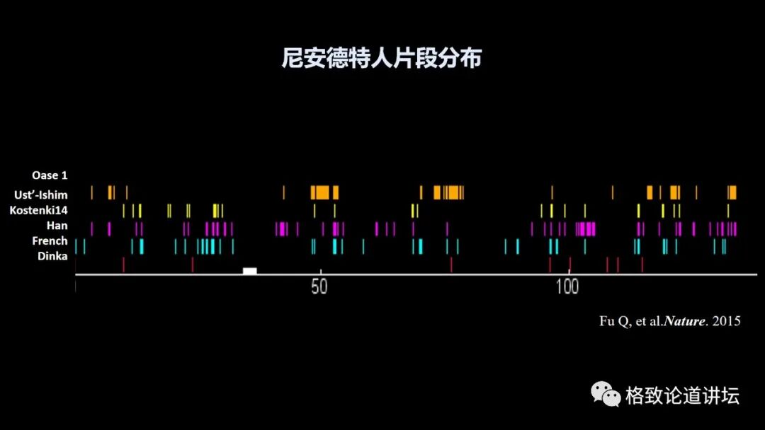 图中现在看到的这些有颜色的这些片段,其实都是尼安德特在现代人基因组中的体现。