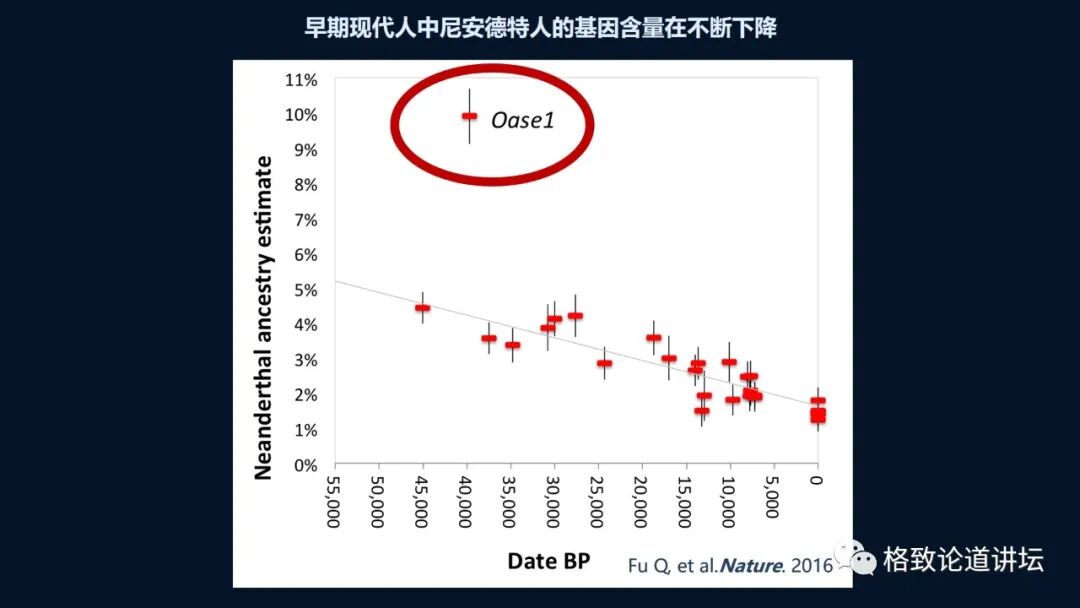 这个个体很特别,这张图中是4.5万年到7000年甚至到现在,整个尼安德特人在现代人的尼安德特成分的变化。