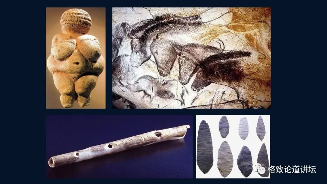 图中所有的物质,包括古笛、岩画甚至雕塑,都是几万年前的人类生产的。