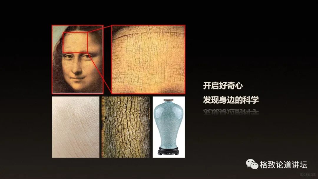 比如蒙娜丽莎,这个油画表面实际上有很多裂纹,这是它的颜料发生了干裂,还有树皮,甚至人皮肤的纹路,包括陶瓷等。