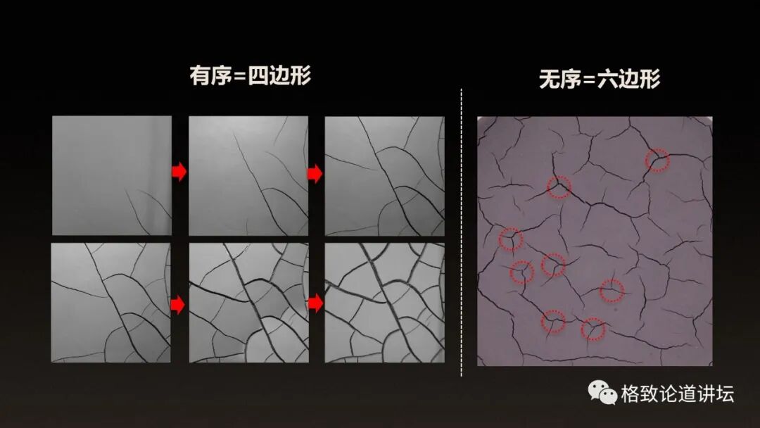 而如果土样表面是一个无序发育的裂隙,比如同时产生很多条裂隙的时候,它基本上形成120度角,也就是Y形的节点,向六边形过渡的。