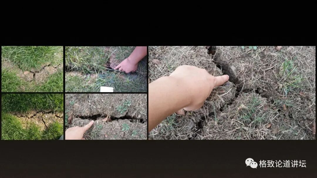 我们也通过一些实地的走访调查发现,即使这些土体表面有植被覆盖,仍然可以发现大量的龟裂,甚至这些裂隙的尺度非常大,一只手都可以伸进去。