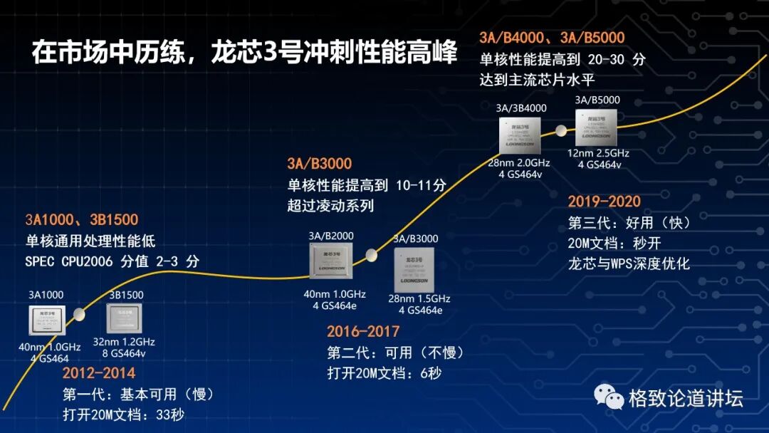 所以从3A1000到2000,我们用完全一样的工艺,只靠设计,就把它的性能提高了三四倍,到今天最新的产品,已经足足提高了15倍以上。