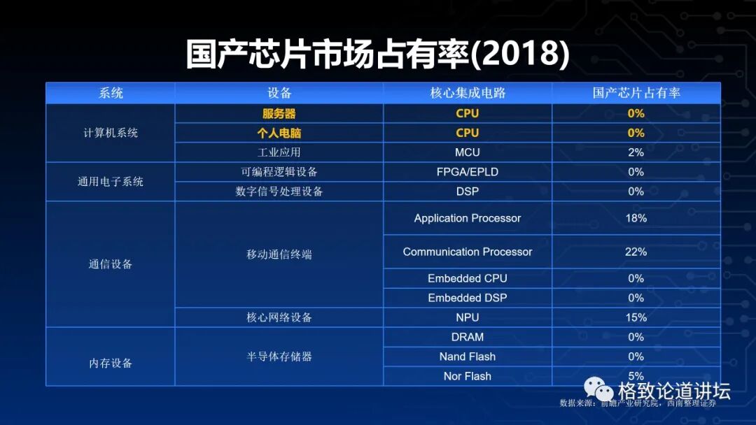 国产芯片的市场情况是非常堪忧的,我们可以看到,各种领域里,国产芯片的占有率很多都是零,包括个人电脑和服务器里用的CPU。