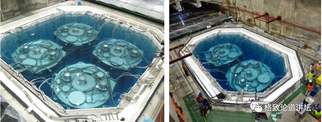 这是大亚湾实验探测器的照片,照片中有几个钢桶,这些钢桶就是中微子探测器,它们有几十吨重,放在一个水池里面。