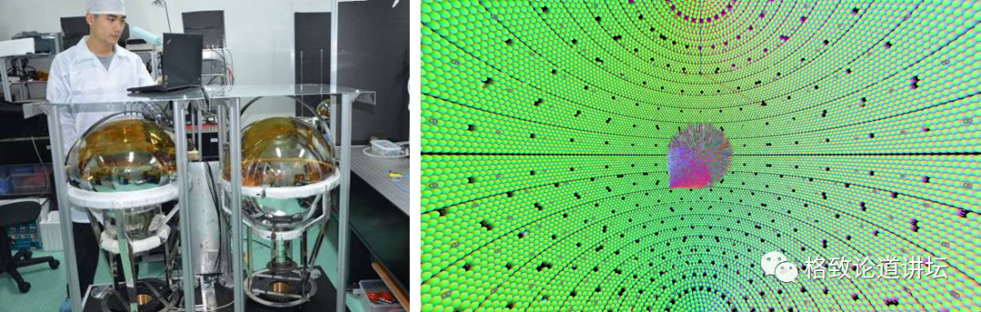 从图中可以看到江门中微子实验探测器的情况,右边是一个直径40米的大圆球,有十几层楼那么高,里面装有2万吨的液闪,左边是大亚湾探测器,从图中对比来看,大亚湾探测器显得很小,里面只有40吨的液闪。