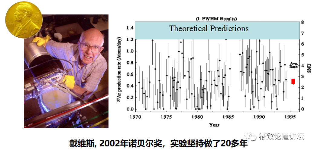 他在1968年就看到了太阳中微子,但是令人疑惑不解的是,太阳中微子的数目不对,跟预测的相比,只剩下了1/3,有2/3的太阳中微子不知道去哪儿了,他就继续找,一直做实验,做了20多年的实验。