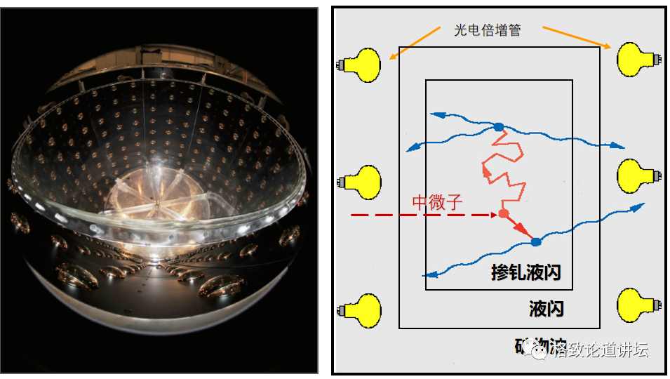 大家可能很好奇,中微子探测器的内部是什么样的,这张照片有些魔幻,中间透明的部分是有机玻璃罐,这里面放着一些会发光的液体,当中微子打到这些液体里面,会发光,这些光会被附近灯泡状的东西接收到,从而捕捉到中微子信号。