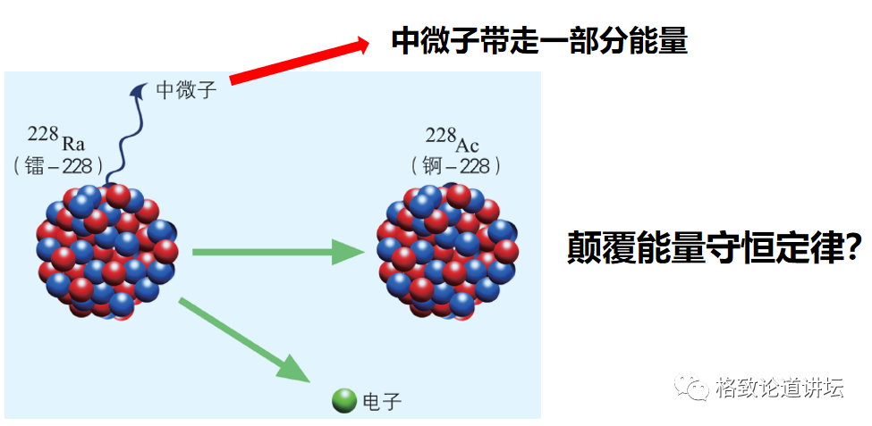 泡利把这个粒子叫中微子,他说正是由于中微子带走一部分能量,所以我们看到的能量就是少了,如果把中微子的能量算进去,能量还是守恒的。