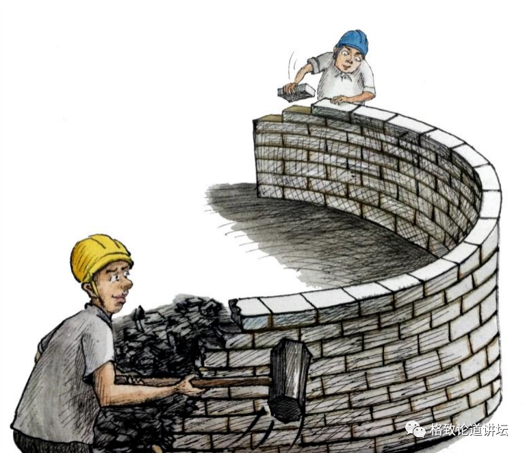 我就通过时空缩短的办法,一个人正在砌墙,另一边又有个人在拆墙,就把时间缩短了,也有戏剧性的效果,讽刺边建边拆不合理的现象。