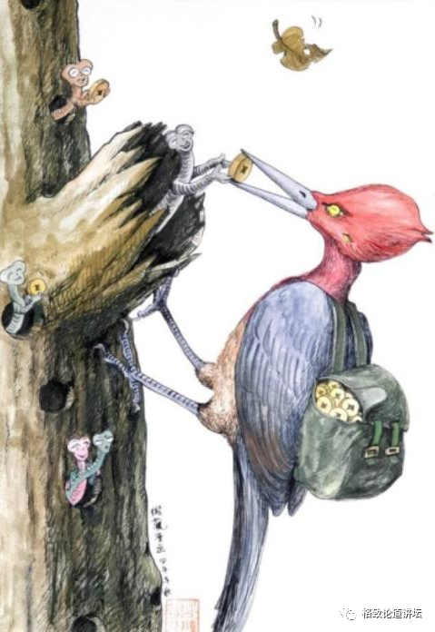 我就想到了啄木鸟,在印象中啄木鸟是一个森林医生,但是如果在它背后加一个背包,里面可能装有很多不义之财。