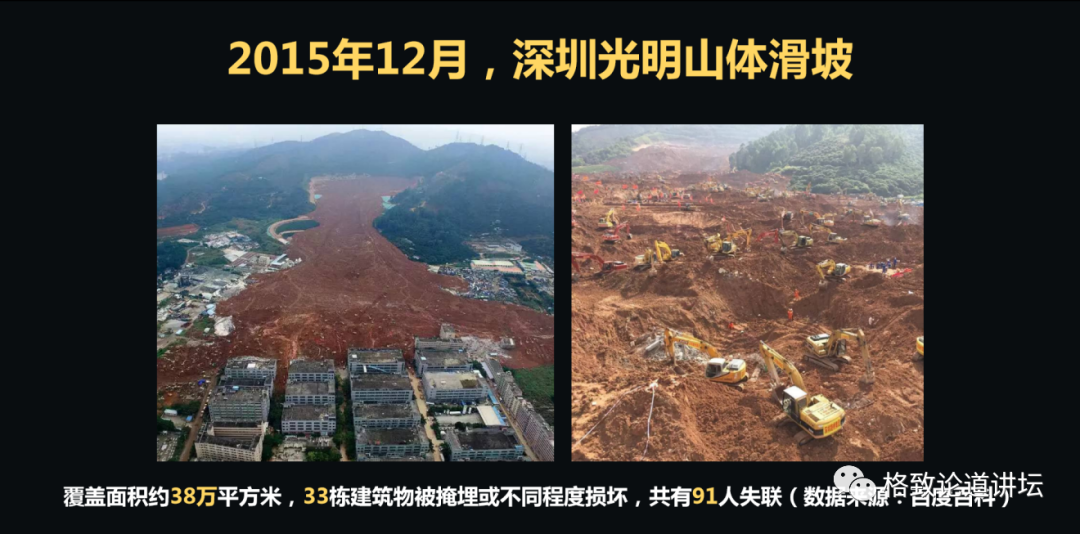 2015年12月,深圳发生了光明山体滑坡的严重事件,倾倒覆盖面积达到38万平方米,相当于38个足球场大的地方,都被山体滑坡的淤泥覆盖了。