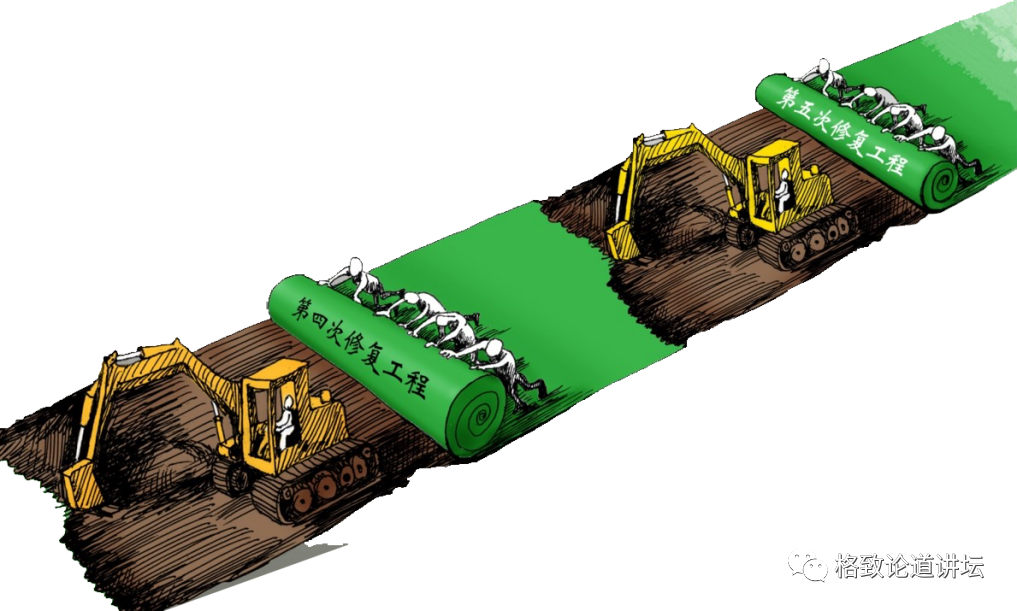 这个新闻的来源是一个公司在绿化,三个月之内进行了五次修复,这是多么折腾的事情,这张漫画也是讽刺这个公司没做好规划,造成很大浪费的现象。