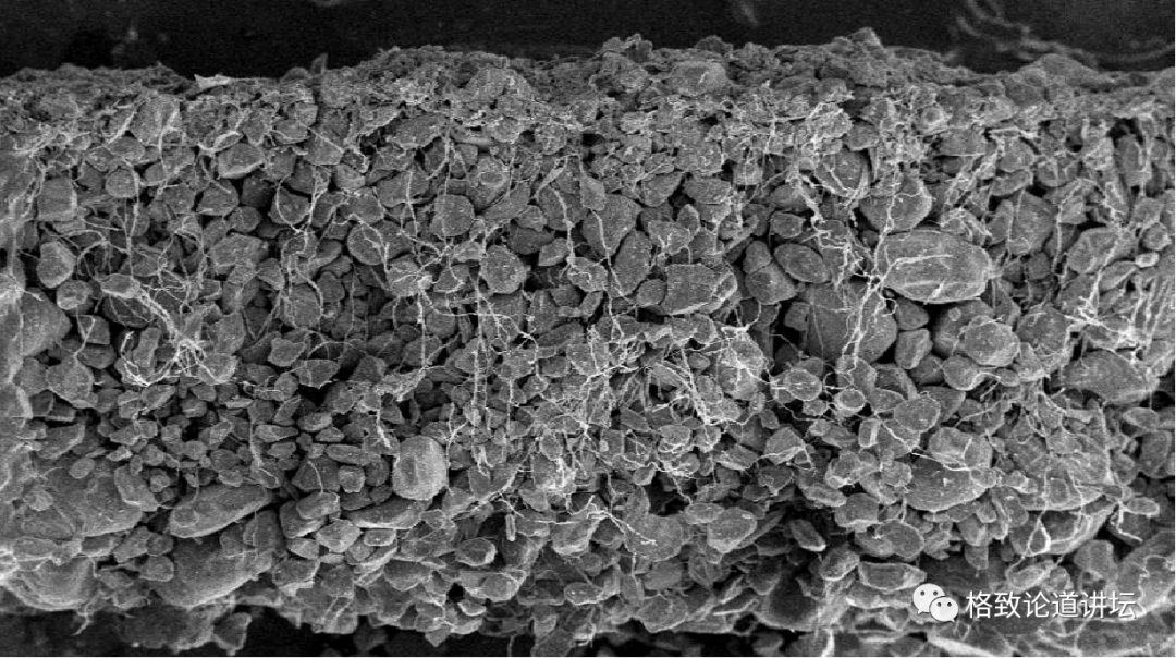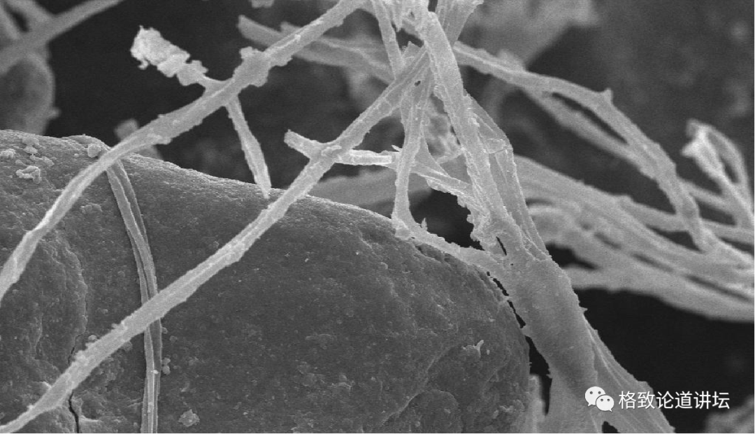 我们把这个薄层放在电子显微镜下观察。放大2000倍后,可以看到,薄层中间被很多绳索状的东西捆绑着、缠绕着,维持着某种结构。