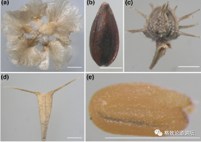更为奇怪的是,这些绿色植物的种子比我前面列举的植物种子还要怪异——它们的附属物很长、很大。它们就长这样,那层黑乎乎的东西还是结皮。