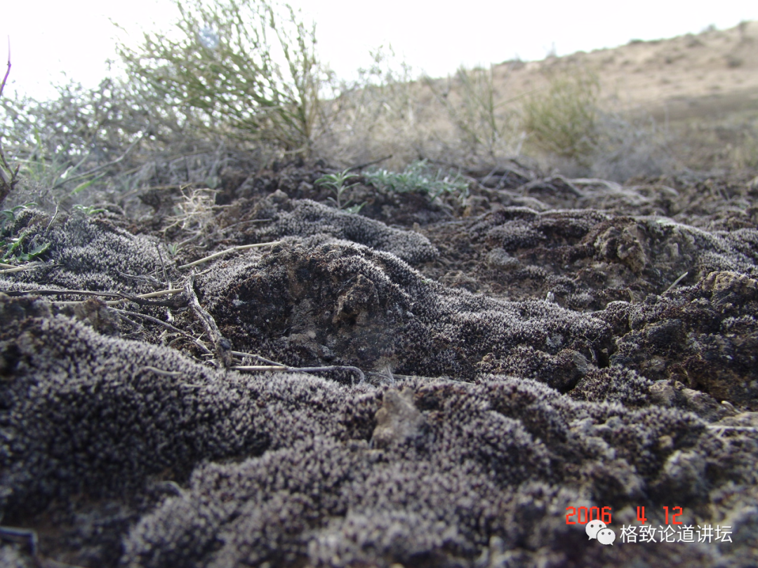 从上图可以看出来,这些苔藓植物并不乍眼,覆盖在地表上,看起来既干又黑。我们当时既不知道对于沙漠来说它们有什么作用,也不知道它们究竟是如何生存下来的。