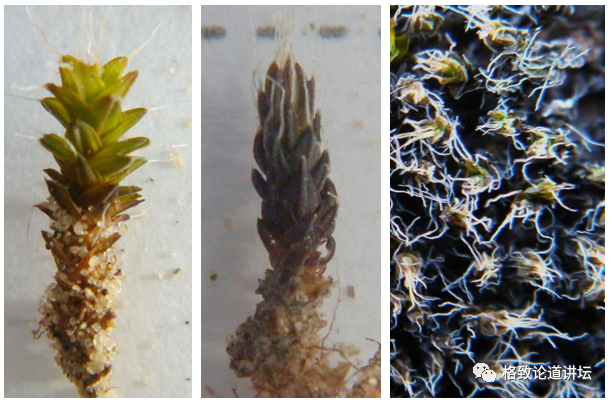 我们看最左边这张图,当苔藓植物生长的时候,它的植株肯定是绿色的;但是当外界条件不利于它们生长时,植株就变成了黑色。与此同时,苔藓植物会把所有的叶片收起来,紧靠茎干。