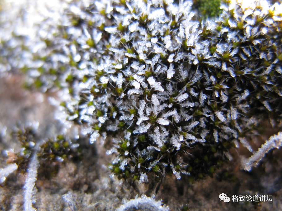 我们把积雪拨开后,秘密就解开了:苔藓植物体上都带着冰晶,它们顶着满头的冰在“高兴”地生长。你们看,植株都是绿色的,绿色就意味着生长。那么,在这样恶劣的环境下,它们是如何生长的?