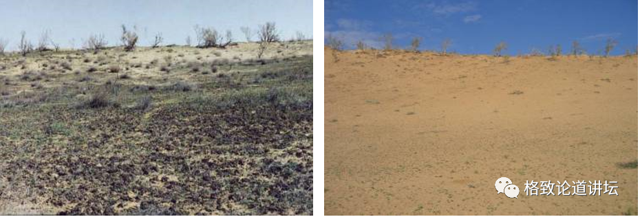 通过这两张照片的对比,我们知道,对沙漠来讲,这层东西就相当于一个保护层,所以我们把它称为沙漠“皮肤”。我想大家现在可能会理解了这个概念。